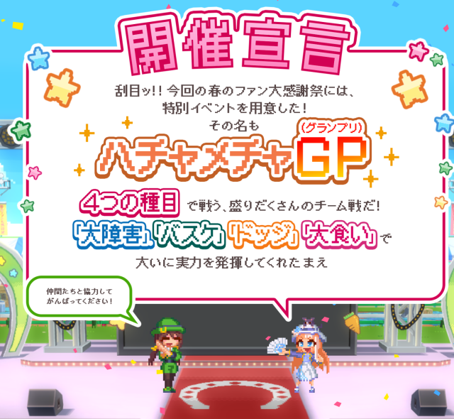 這次的《賽馬娘 Pretty Derby 熱血喧鬧大感謝祭!》以繼承了這些賽馬名稱的「賽馬娘」展現熱血運動會的趣味風格,展現不同於賽馬場上的趣味賽事,體驗馬娘的不同魅力!