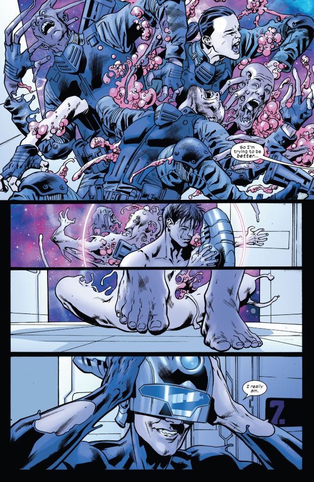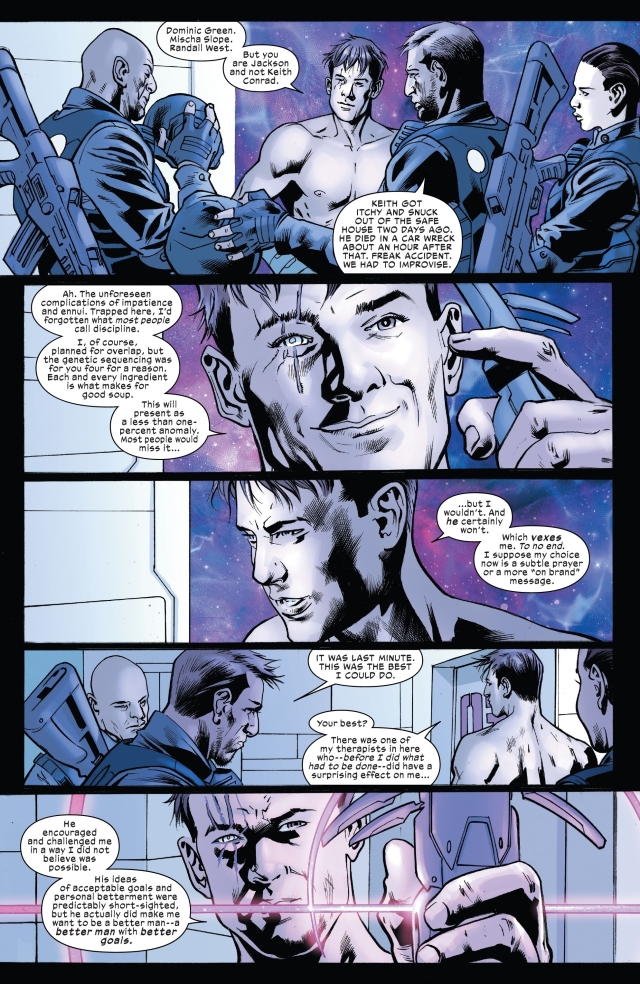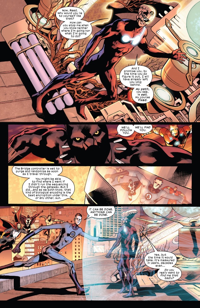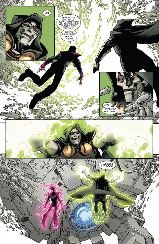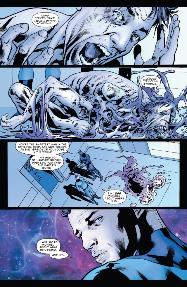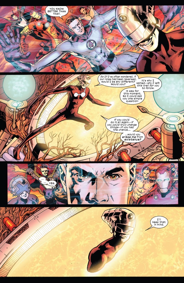 有趣的是,造物主表示自己真的試圖去變成更好的人,但是即使是他也有極限。而過去在Hickman的《新復仇者》第29期當中,里德的死對頭「末日博士(Dr. Doom)」就曾經表示過「世人皆有極限,唯有末日不然」。