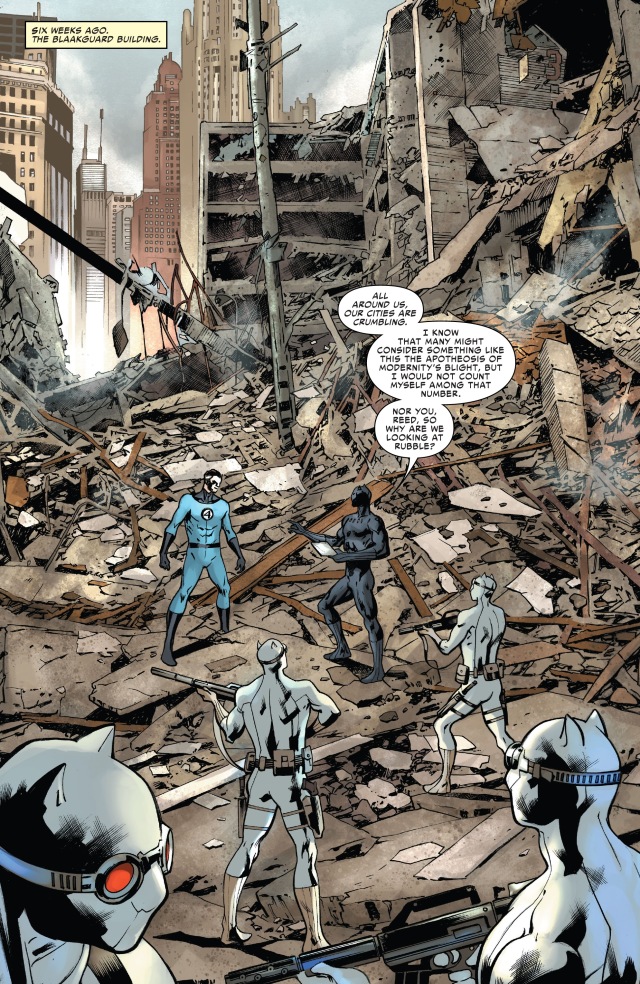 而黑豹發現了這個遺址正是屬於政府組織「災害控制局」(Damage Control)所有,而神奇先生一聽臉色大變——因為他很清楚自己的平行宇宙體「造物主」,全多元宇宙最危險的男人自從被變種人富豪/智謀家「太陽黑子(Sunspot)」擊敗後就是被他們收押的。