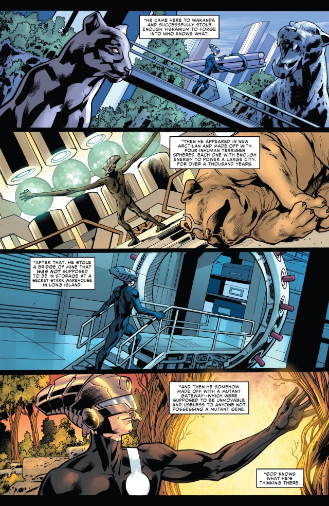 他去到處偷東西啦。先到瓦坎達拿了一堆超好用的汎金屬,再到似乎是異人族(Inhumans)新城市的New Arctilan偷走了巨大的能量源;接著,則是鋼鐵人之前散盡家財買走的眾多大規模毀滅性武器當中包含的一座「架橋(Bridge)」,神奇先生開發來觀測與穿越多元宇宙的機器;他甚至還設法弄到了只有變種人能使用的克拉科(Krakoa)傳送門,而原本這個傳送門應該是沒辦法被移動的。