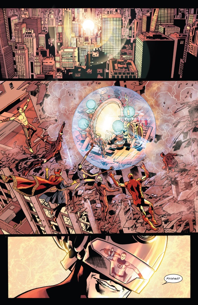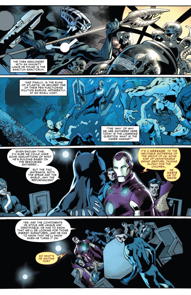 最後,顯然造物主已經做完其他想做的事情了,決定動身離開。而光明會也因此就根據被偷走的物品的能量特徵找到了他。可以看到奇異博士偷偷幫助黑豹和X教授飛行XD