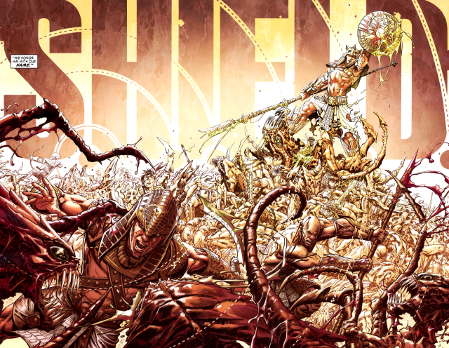 這邊又有另一點,是造物主奪走的槍與盾,也是Hickman在引用自己以前的《聖盾兄弟會》故事。當時,印和闐(Imhotep)在率領大軍對抗孵化者(Broods)時手持的盾與槍後來都成為了守護世界的兄弟會的象徵,更是神盾局(S.H.I.E.L.D.)的前身。