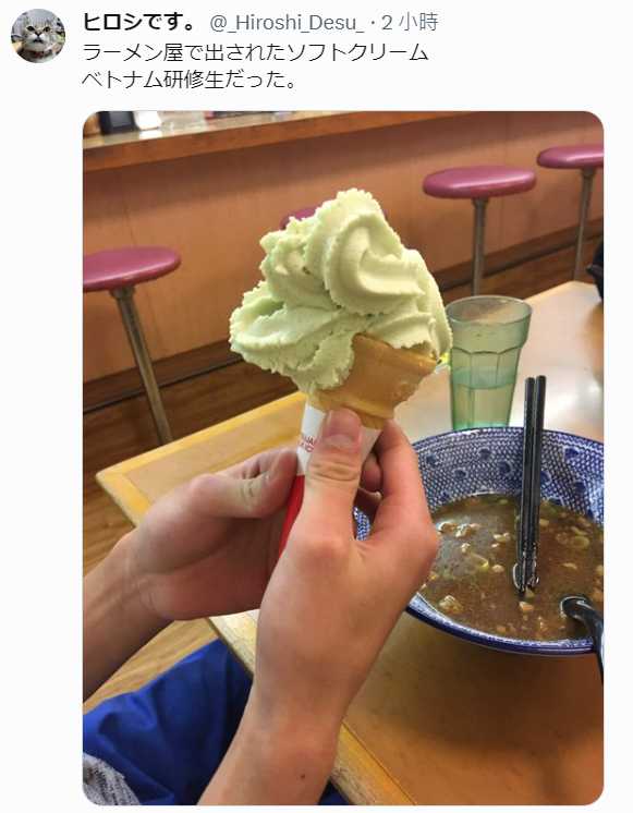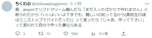 網友:「以前在ampm(便利商店)買過霜淇淋,被店員以『我才剛進來不會做』拒絕了。我鼓勵他說:『很爛也沒關係,我知道這很難。』(我高中的時候在MINI STOP(也是便利商店)打過工)。