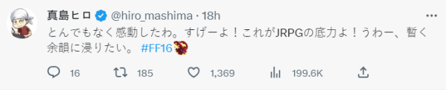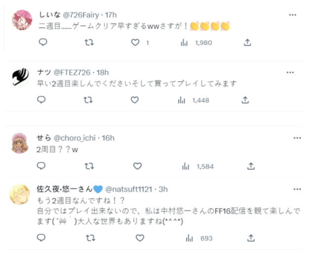 沒想到這個應該很繁忙的漫畫家,居然在發售三天後就大讚《FF16》太好玩了,幾乎把所有工作以外的時間都獻給遊戲,更是已經準備要挑戰二周目了,推薦大家一定要玩,這個時間速率...跟鬼一樣阿。