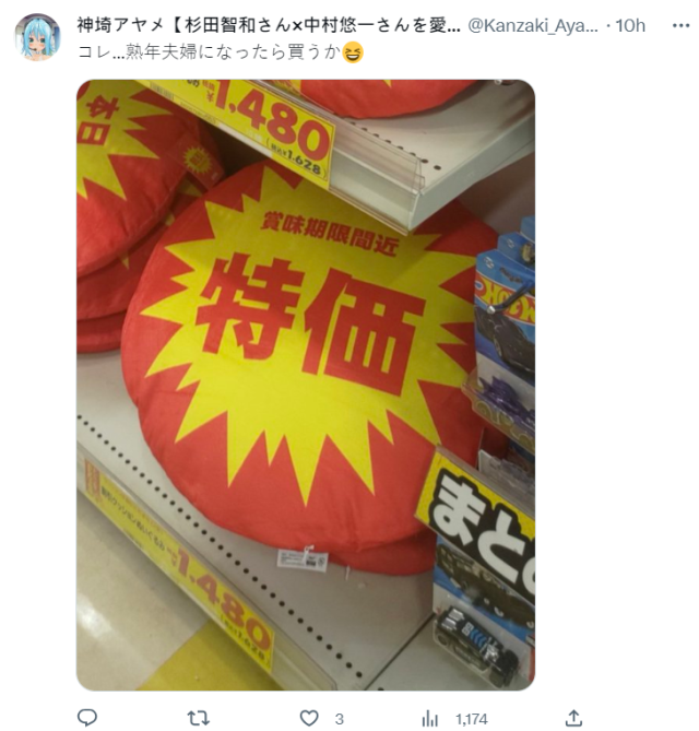 各位也知道日本夫婦會使用「YES & NO」枕頭來表示今晚想不想...要,至於這個「品嚐時間接近,特價」的抱枕,好像滿適合熟齡夫妻的 ( ? )