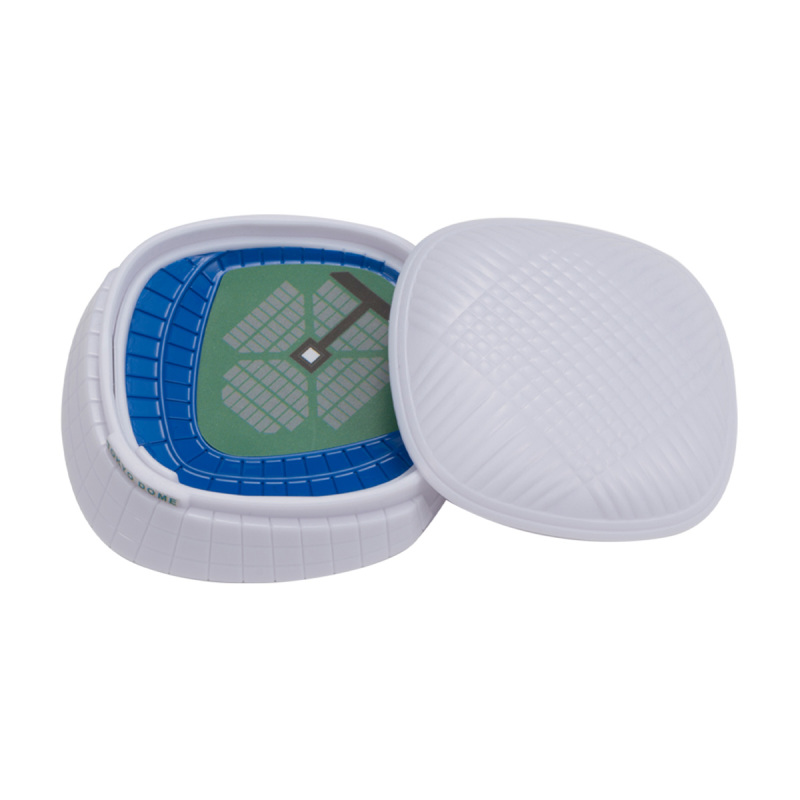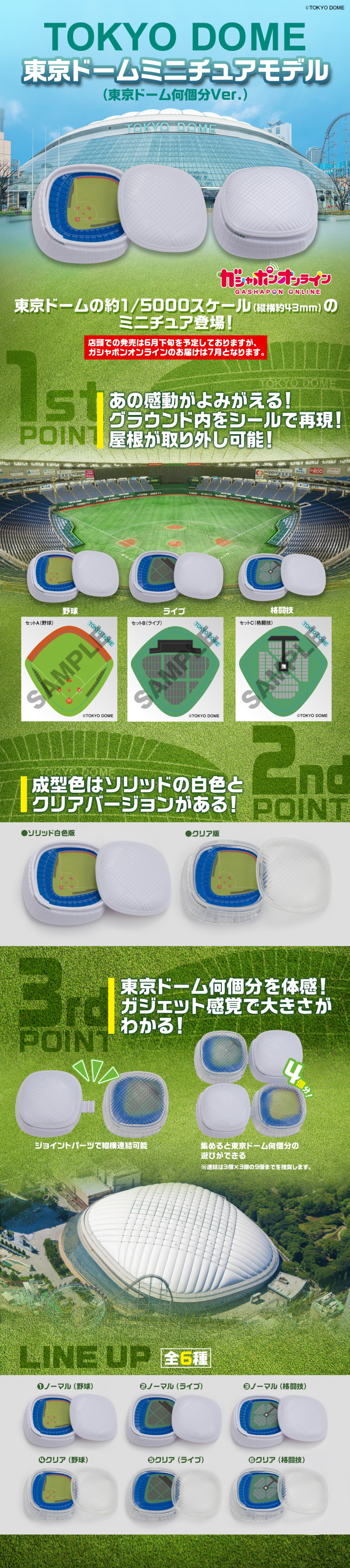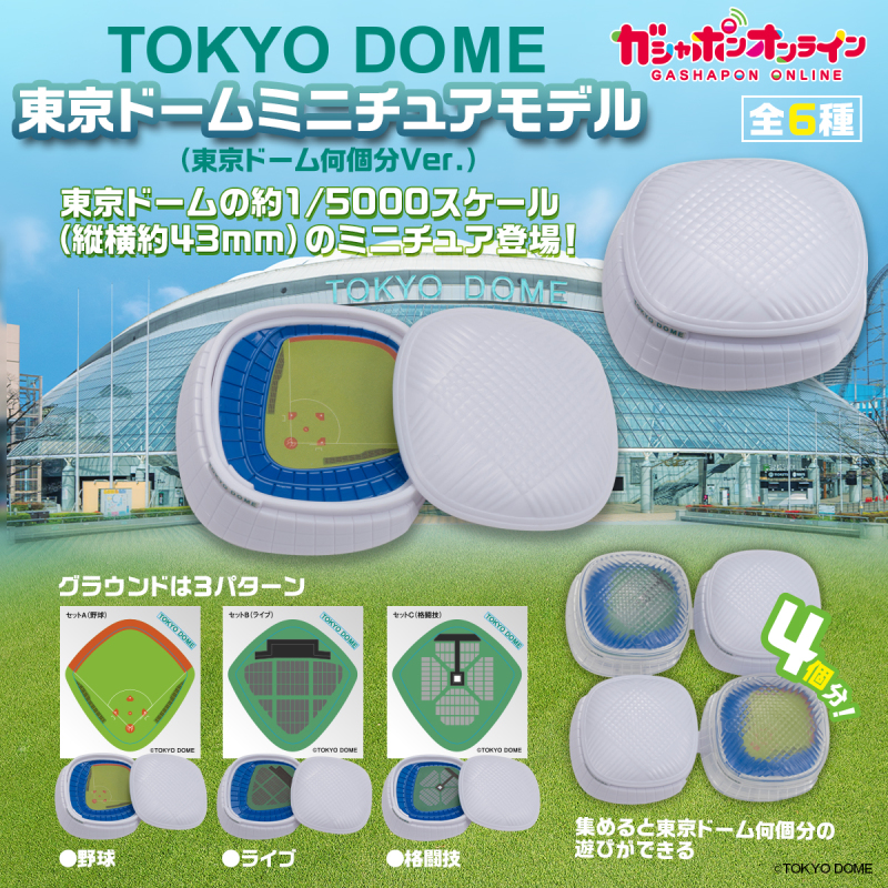 這款以東京巨蛋為造型的迷你造型轉蛋玩具,以1/5000的比例將其縮小至大約長寬各4.3公分左右的迷你尺寸,並且將巨蛋的屋頂設計為可以掀開,可以看到巨蛋裡面的模樣。花色有棒球場、演唱會、以及格鬥技比賽三種花色,巨蛋的蛋殼也有普通白色和透明外殼兩種,總共就有六種款式。還可以透過連結零件,將數個巨蛋給連接起來,放在桌上擺飾相當可愛喔!