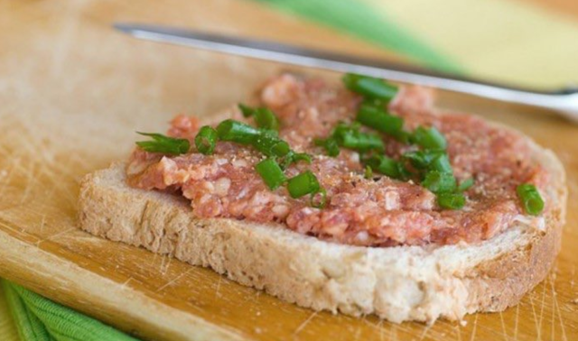 這餐點在德國稱作 Mettbrötchen,也稱為 Hackepeter,其實在德國與波蘭都可以看到,是用鹽和黑胡椒調味的切碎生豬肉製品,將其放在麵包的兩半上,可選地在頂部撒上生洋蔥,看起來就像漢堡一樣。