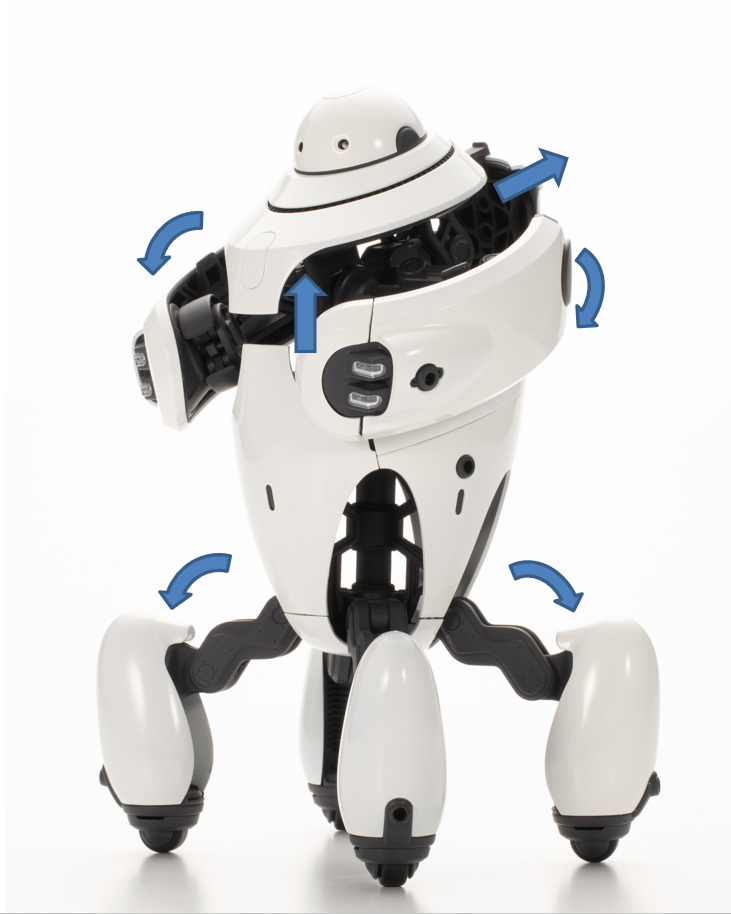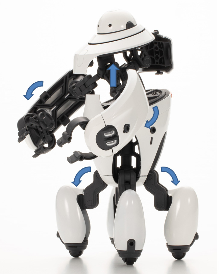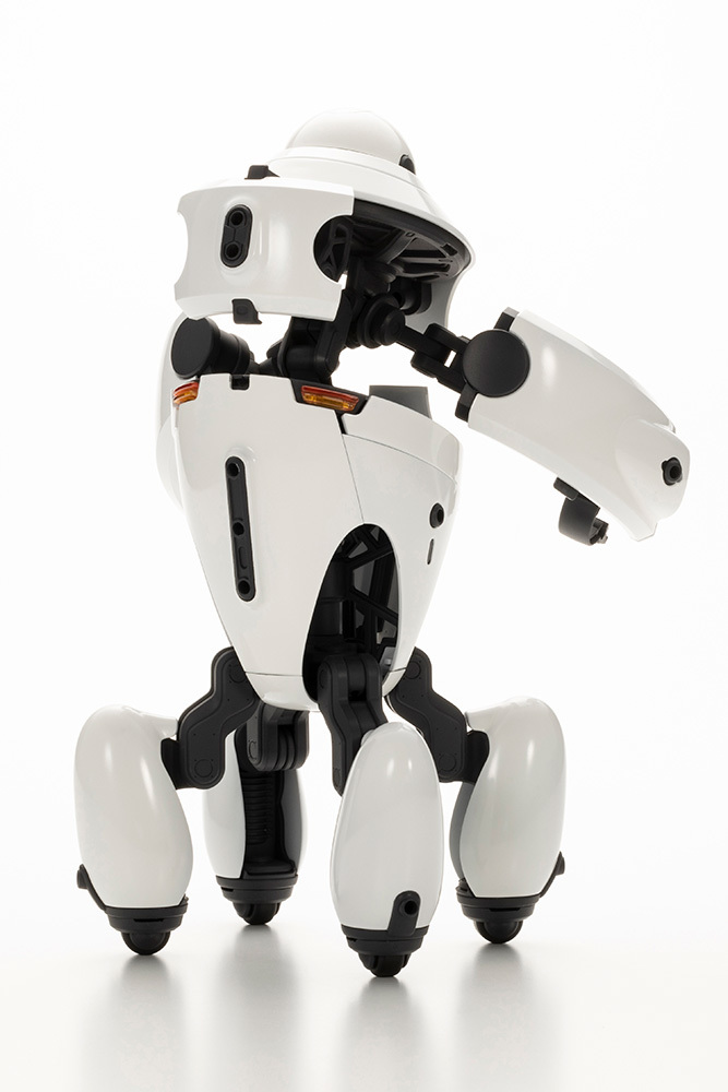 MAMORU 的骨架擁有多達 55 處可動部位,能從圓滾滾的「一般模式」變形為展開四足與雙臂的「作業模式」,兩側腰部更能展開小小的輔助手臂,把玩出意想不到的超靈活動作!此外頭部附有「一般型」、「強化感測裝備型」可替換,其中「強化感測裝備型」還能前後反轉成「消除者模式」。全身多處使用共通規格的 3mm 孔連接,能使用壽屋推出的各系列組裝模型自由改裝!