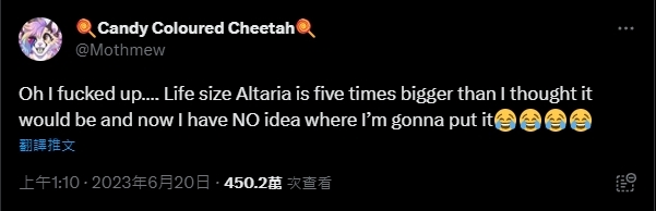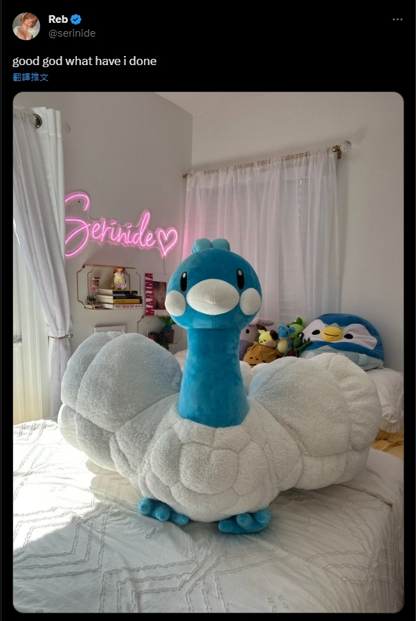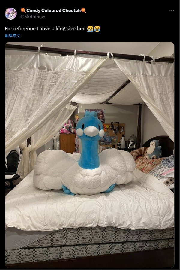 夾雜在開心與困擾之間的也不只是她,下一個案例是名叫Candy Coloured Cheetah(@Mothmew)的推主,她同樣也買下了1.1公尺長的七夕青鳥,並且擺在她那張據說已經是特大號的床上,而顯然七夕青鳥的總體積,也足足佔走了這張床的四分之三,這使她哭喊「牠比我想像的還要大上五倍,我不知道我應該把牠放在哪裡才對」,並說現在這張特大號的床,已經屬於七夕青鳥了~