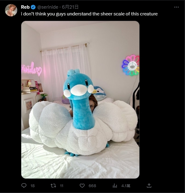 例如說,這位名叫Reb(@serinide)的寶可夢粉絲,就是處在一個在開心與困擾之間反覆橫跳的矛盾狀態,雖然拿到的當下確實是很讓人興奮,但一想到這布偶究竟是要放在哪裡時,Reb就配圖流露出最真實的心得:「你們不懂這傢伙到底有多麼巨大」,甚至在這張照片中,幾乎快看不到推主本尊了XD