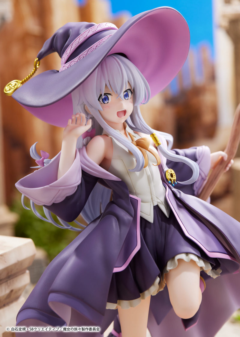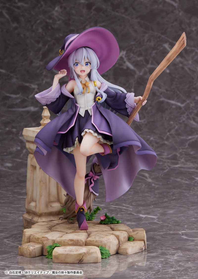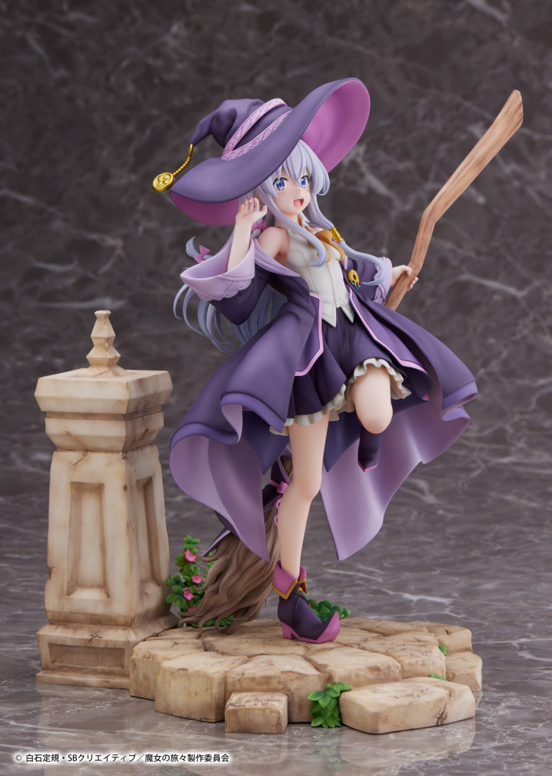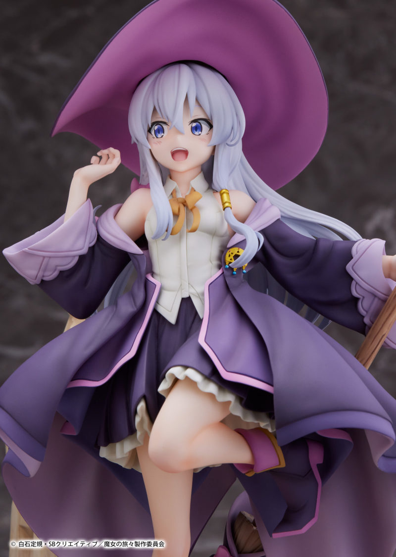 這款由PROOF所推出的伊蕾娜,以1/7比例製作,高度約25.5公分,但由於其魔女帽是可以自由穿脫的,拿掉帽子的高度約為24公分。帽子與頭部內崁有磁鐵用來吸附連接。伊蕾娜整體的造型依舊是以內裝搭配紫色系魔女長袍,本款的內裝為無袖襯衫搭配裙子,可以看到伊蕾娜小露香肩和美腿的些微性感,搭配她躍動十足的動作,不失俏皮可愛。每處的細節都相當仔細還原,包含胸口的魔女證明胸針,帽子上的尾端徽章等等。搭配岩石造型的台座,充滿著冒險旅行的氣氛。