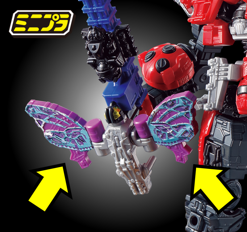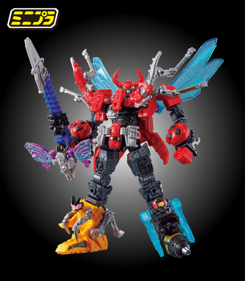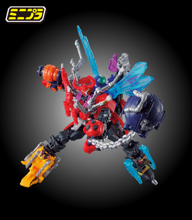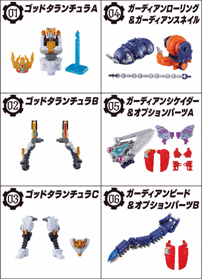 其中狼蛛神/狼蛛騎士必須湊齊三組零件才能組成,可自由選擇變形為狼蛛神或狼蛛騎士形態,並能如同劇中裝備守護者武裝蟬之刃、蜈蚣鏈鋸,此外蟬與蜈蚣的商品中更附有能升級第一彈「君王者」的零件,能夠大幅再現劇中合體後比例的鍬形蟲神翅膀、守護神劍的蝴蝶翅膀...等造型!