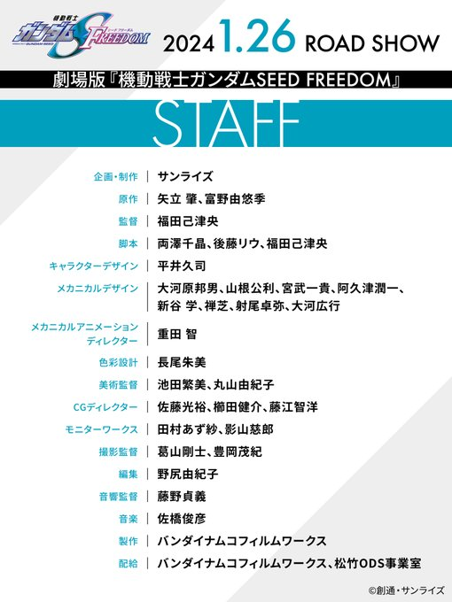 這次也正式宣布,由動畫導演福田己津央繼續擔綱導演,已過世的兩澤千晶與福田 & 後藤リウ協力構築劇本,其他團隊大多都與電視動畫團隊相同,相信各位 SEED 老粉等了這麼久終於劇場版千呼萬喚始出來阿 !!!