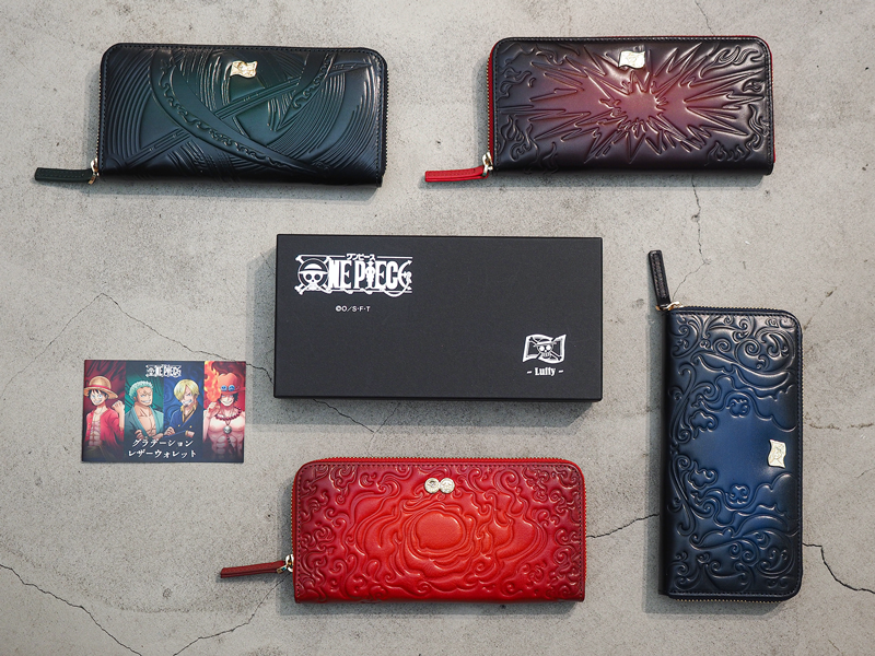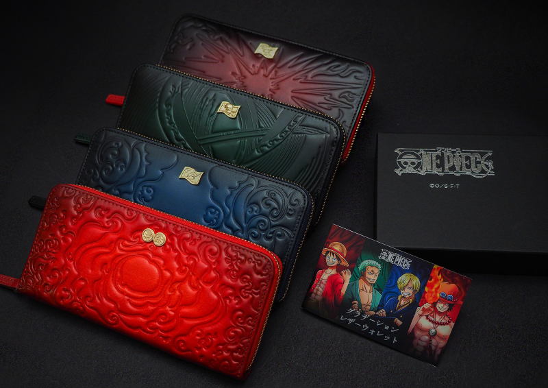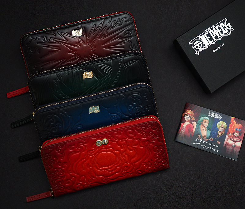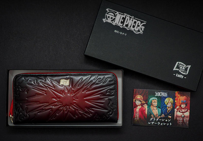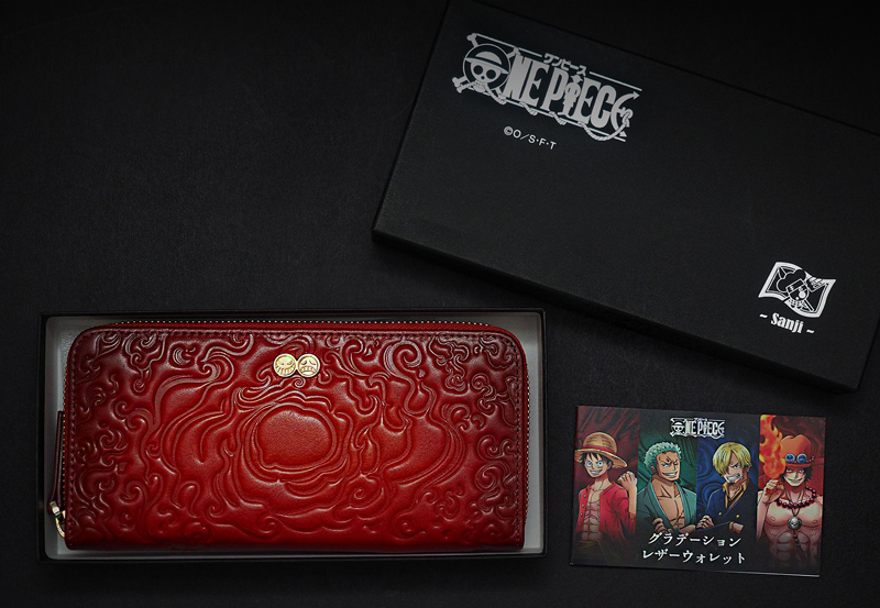 「航海王漸層長皮夾」,採用牛皮製作,擁有展現「霸氣」的漸層色,配合每個角色形象特製獨家染料上色,以中心淡、外層深的漸層效果加工,展現動畫般的動感效果,加上角色特色的立體浮雕:席捲火焰而來的衝擊波、神速三刀流、縈繞煙霧和火炎漩渦等等角色獨特招式圖騰,展現航海王獨有收藏價值,一開箱就能讓航海王迷們高潮啦!