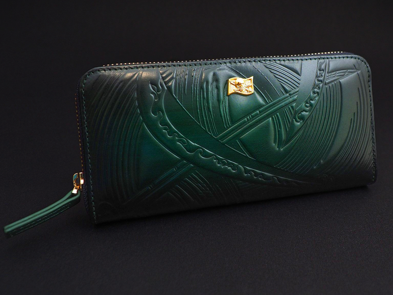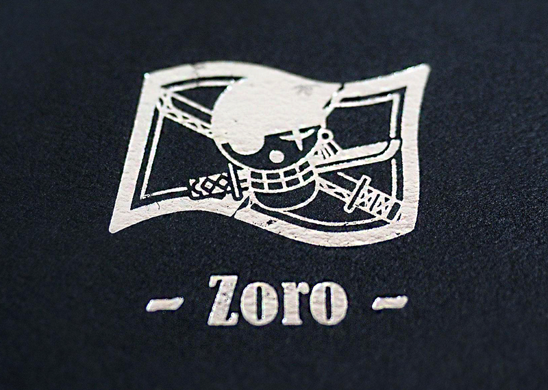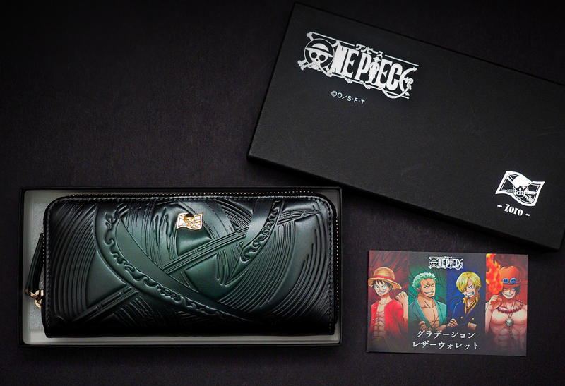 以索隆的代表色綠色,加上令人不寒而慄的黑色漸層呈現,以在和之國入手的大快刀二十一工 閻魔、和道一文字以及三代鬼徹,將刀劍之氣透過壓印立體加工在皮夾外層展現,從視覺、立體壓紋觸感就能感受到索隆強而有力斬擊速度。
