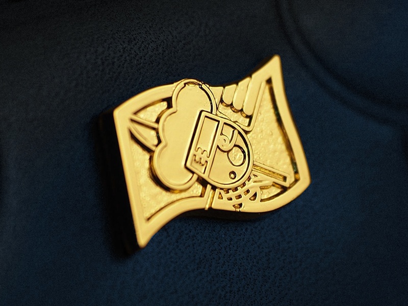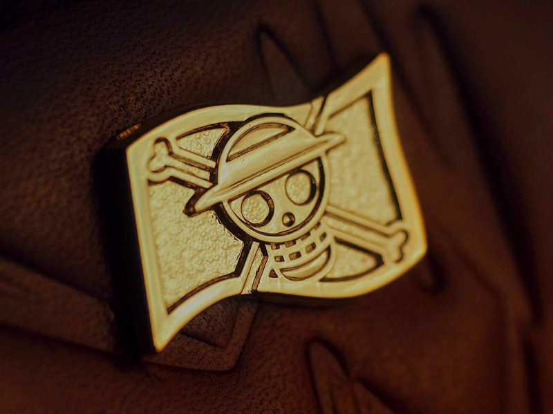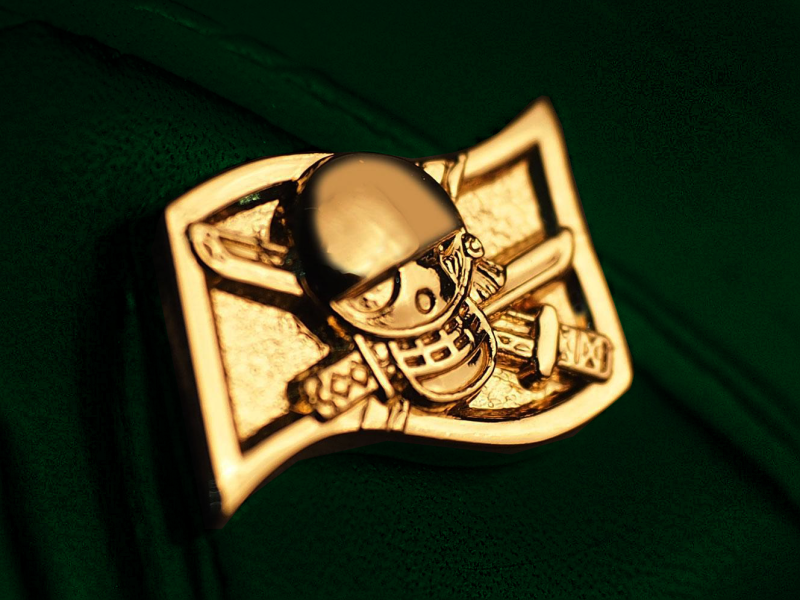 金色徽章如飄揚的海賊旗,上面刻有索隆的骷髏頭標誌。