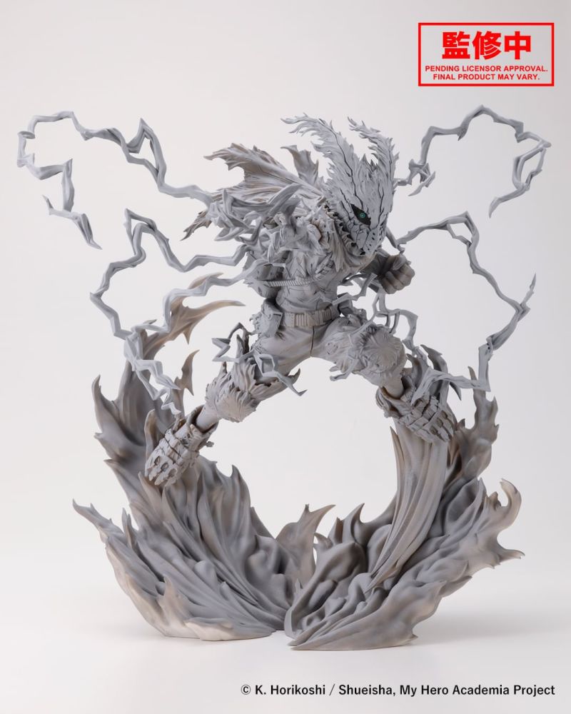 即將在 ARTFX J 系列正式商品化的「黑化出久」預計會是系列一貫的 1/8 比例,依照動畫設定再現了綠谷孤身一人不眠不休地奮戰、帶有強烈壓迫感的戰鬥姿態,雖然目前是監修中的未上色灰模,可光是細部造型的刻畫就傳達出強烈魄力、讓人萬分期待!戴上面罩之後十分兇狠的銳利感、傷痕累累的戰鬥服、逼真躍動的披風,以及纏繞在身體周圍類似閃電造型的特效件、用來當底座的巨大特效件都超級帥!好想趕快看到上色之後的實體啊。
