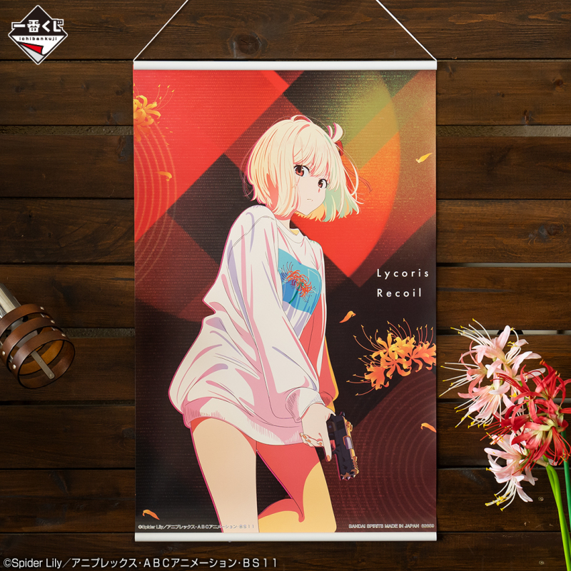 A、B 獎將新規繪製的錦木千束、井之上瀧奈超美插畫製作成全長約 66 公分的布掛軸,除了以高解析度呈現角色本色細膩的筆觸外,也運用了表現兩位角色個性的背景色調,以及「莉可麗絲」名稱由來、象徵作品世界觀的植物彼岸花(石蒜)元素。