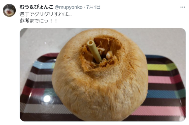 最後是靠剪刀勉強戳了一個洞,然後推主的家人把椰子剖開,吃到了裡面的果肉。(可喜可賀!)