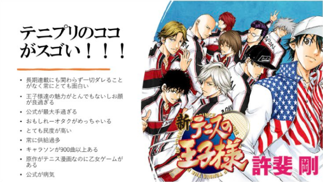 《網球王子》(後簡稱網王)的粉絲カトリーナ(@NEKONEKOnyaaap)日前製作了一份《網王》的傳教PPT簡報(沒錯,粉絲們常常在作這種事),看過的人紛紛盛讚寫得太好了。裡頭表達了她認為《網王》的魅力點所在,也抓出了大家可能會感興趣、粉絲也津津樂道的名場面。