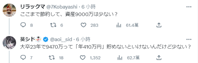 網友:「從大學畢業算的話23年存9470萬,也就是『一年必須存410萬』耶(相當於台幣約90萬),這樣有很少?」