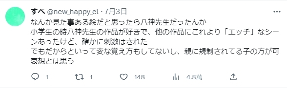 其中,其實不少網友都說自己小學時代也曾經看過同一位作者的漫畫。也有人表示,「讀小學時看的同作者作品裡面還有更『H』的情節,確實是有覺得被刺激到。但還是覺得被家長規制的小孩很可憐。」