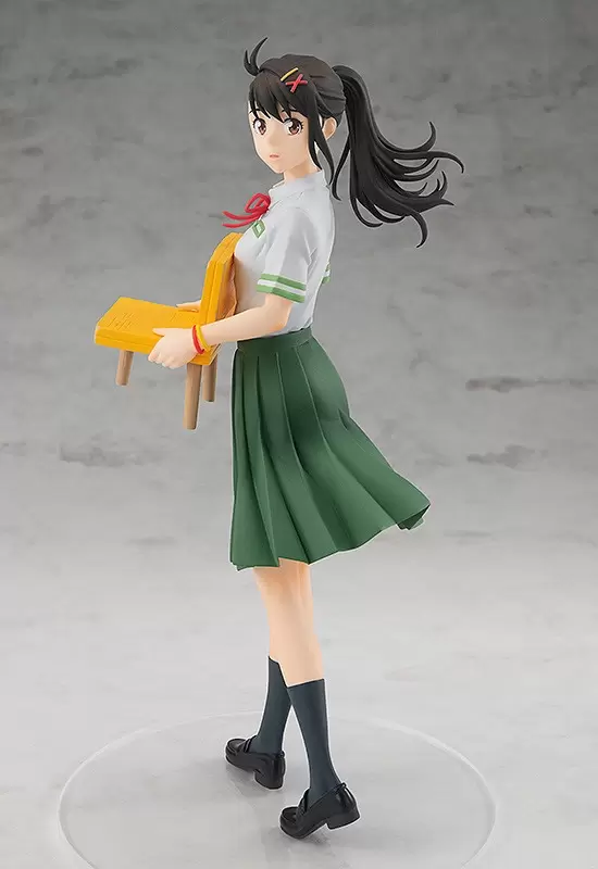 「POP UP PARADE 岩戸鈴芽」PVC模型,尺寸全高約 17 公分,以鈴芽手拿著草太椅子的電影海報為基礎,將淡淡表情的鈴芽立體化。側身的站姿凸顯頭髮和制服裙子的吹拂,制服的紅色小領結和手環、髮飾等細節皆仔細膩呈現;手中的椅子也有木紋、磨損的刻畫,令人聯想起劇中緊張的冒險!
