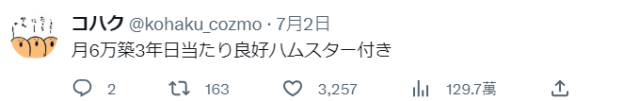▼網友想的租屋簡介:「租金一個月6萬屋齡3年採光良好附倉鼠」