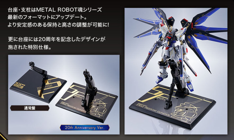 此外黑色的台座也與過去版本不同,採用近年 METAL ROBOT 魂系列商品使用的新規設計,相較舊版本能夠自由調整高度並擁有更高的穩定性。上方印製的金色圖樣也採用了印有攻擊自由鋼彈頭像的新設計,用以紀念《機動戰士鋼彈SEED》迎來 20 周年。