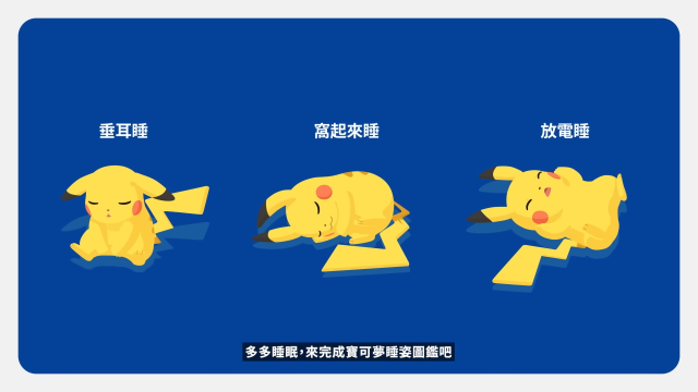 例如說,像皮卡丘就分成了:「垂耳睡」、「窩起來睡」、「放電睡」等三種睡姿,只要多多睡覺,就能夠完成你的「寶可夢睡姿圖鑑」。