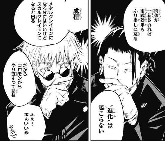 而五條就以「數碼寶貝進化論」來舉例,變成機械暴龍獸很好,但如果進化成喪屍暴龍獸就糟糕了,所以必須回到滾球獸 ( 與星漿體同化 )。