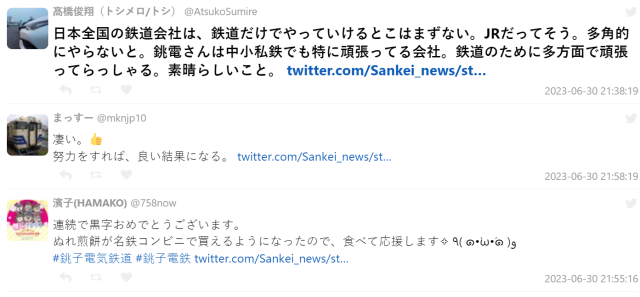 像這樣能扭轉頹勢的小型鐵路企業,不少網友都給予支持,更表示銚鐵販售的點心都很值得品嘗,甚至送禮都是很棒的選擇。