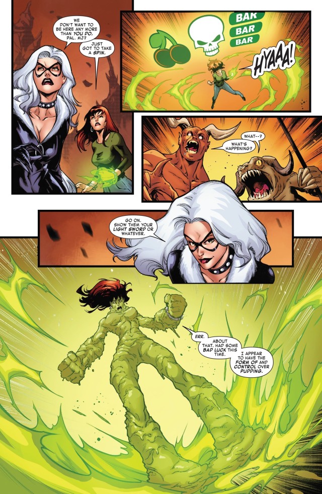 她沒辦法控制自己會得到什麼樣的能力。轉出7通常會變得很強,轉出骷髏頭時通常能力都會很爛很難用;轉出三個7會讓MJ短暫變成類似女神的存在,但要是轉出三個骷髏頭,會發生什麼事情呢?
