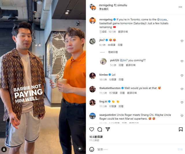 「羅傑叔叔」昨天發布一支和劉思慕在星巴克拍攝的短影片,邀請多倫多的網友們在本周末進場支持劉思慕舉辦的經典賽。還開玩笑調侃:「明天要來看籃球喔,這個小姪子非常缺錢,《芭比》(Barbie) 付給他的錢太少了!」讓劉思慕一臉無奈回應:「這......不是事實。」