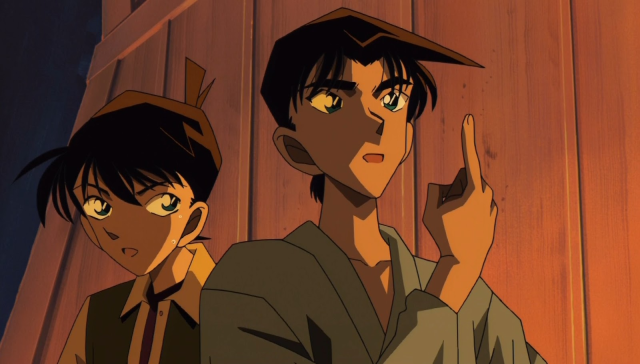 ▼(上排中)2003年劇場版《迷宮的十字路》。每次都是由其他人偽裝成工藤新一,但這集與兇手正面交鋒時卻是由工藤新一偽裝成服部,出手營救被綁架的和葉。而從醫院逃出來的服部之後才混在反派嘍囉中登場。因此這張工藤新一是本人。(但衣服是偷服部的)