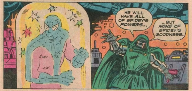 然而,這個複製人卻經常犯下許多愚蠢的錯誤,他甚至無法學習蜘蛛人利用蜘蛛網擺動,還常常撞牆,這徹底惹怒了末日博士。當真正的蜘蛛人再度成功攻陷,並摧毀「雙子機」後,這個愚蠢的蜘蛛複製人也跟著消失在短命的連載中。