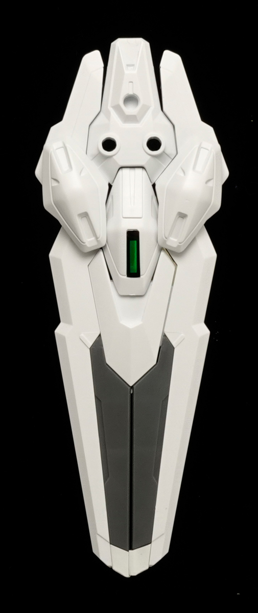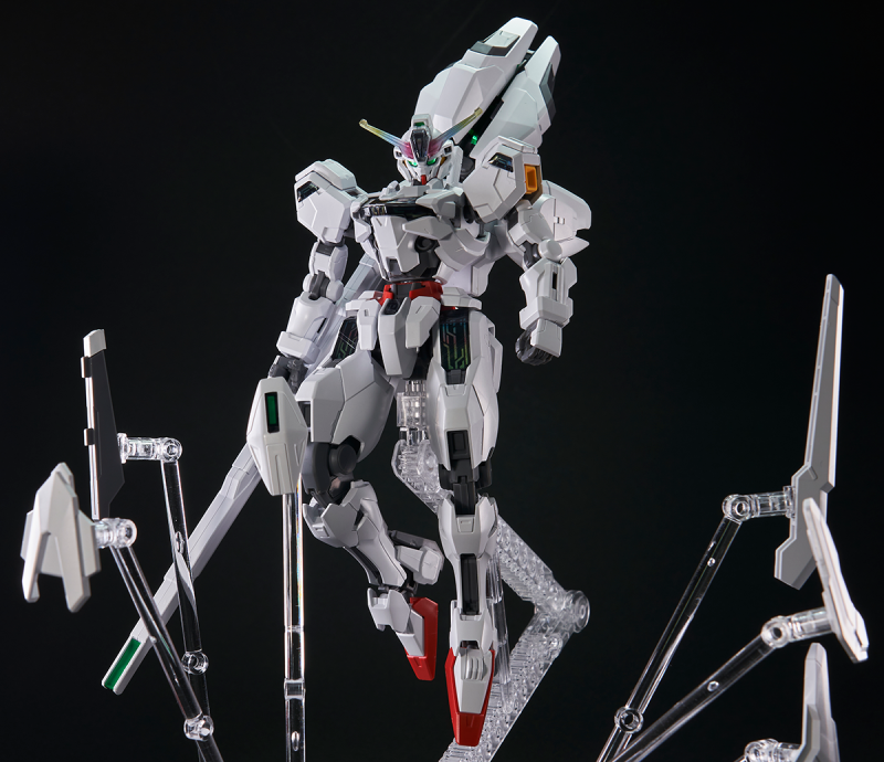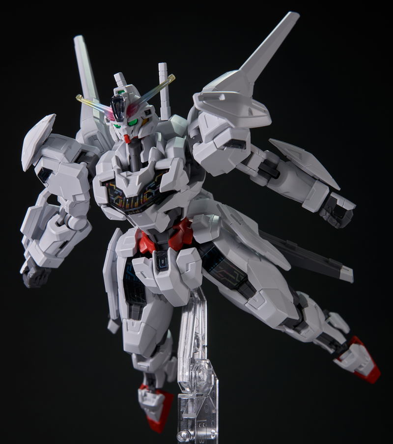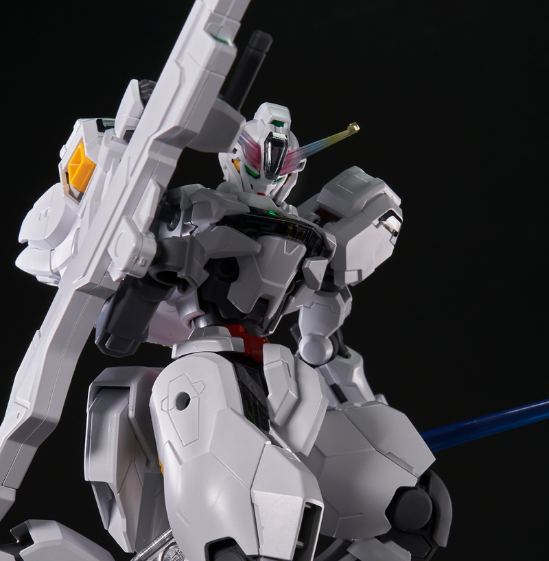 完成後異靈鋼彈潔白的身軀雖看似有些樸素,但也更容易透過陰影變化欣賞裝甲零件的銳利線條、多層次的幾何細節。彷彿魔女掃帚的主武裝「可推進型長程步槍」使用多軸可動輔助臂連接背包,藉此維持單手持槍的強度。末端四具推進器同樣具備展開機構,推進噴嘴的綠色則使用貼紙再現。