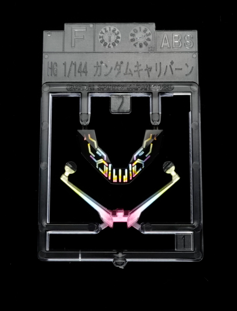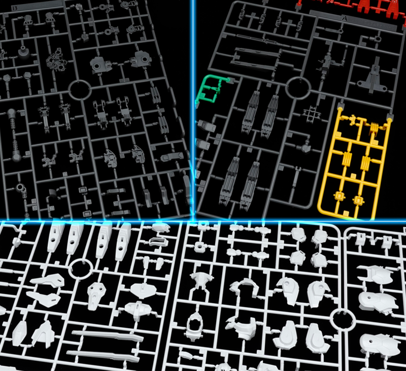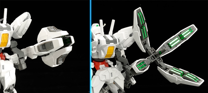 劇情上從風靈鋼彈(修改型)繼承過來的 11 枚 GUND 子機則是兼用零件並改為異靈的潔白成形色,除了同樣能作為感應砲攻擊外,也能裝在身上各處插槽再現提升機體性能的「Bit on Form」形態,部分盾牌零件內側同樣有中空的「偷膠」部分。