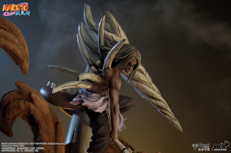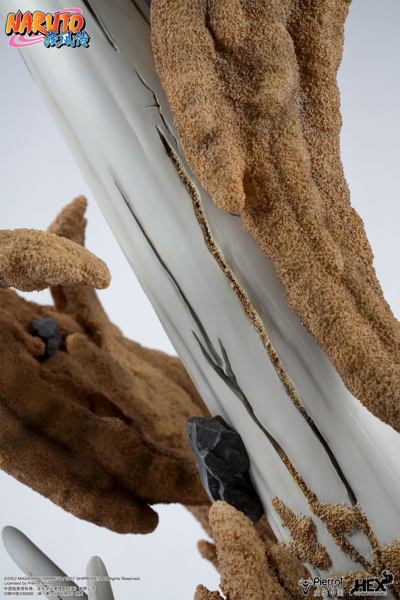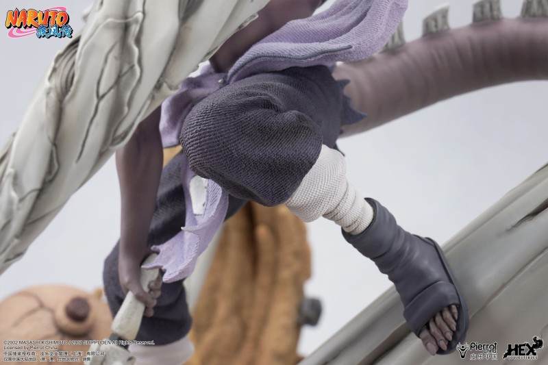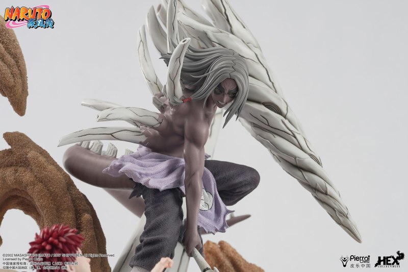 地之咒印·狀態二的君麻呂,皮膚變成了棕黑色,臉上也出現了黑色的斑紋,逼真的肌肉和六條大骨刺從他的背部突出,揮舞著脊鞭,準備用他最堅硬的骨矛刺穿我愛羅,整體散發恐怖氣息又充滿張力!從底座的砂礫中冒出骨刺,為整體設計增添了動感。完美融合角色和場景,以逼真寫實的細節讓經典戰鬥再現,展現出生動的臨場感!