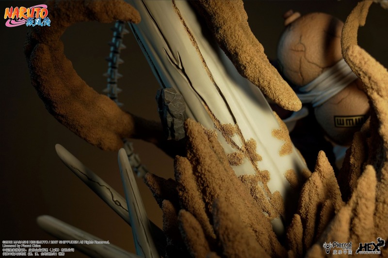 HEX Collectibles「Elite Dynamic Statue 我愛羅vs君麻呂」1/6比例場景雕像,重現我愛羅操縱沙子抵禦君麻呂攻擊的場面。我愛羅退去原本冷血殘酷的模樣,以堅定且成熟的神態回歸救援,刻劃出立足於砂瀑之中的帥氣身影!從背後巨大葫蘆湧現而出的沙子逼真地呈現出顆粒感與粗糙質感,與君麻呂比鋼鐵還堅硬的骨骼交纏。