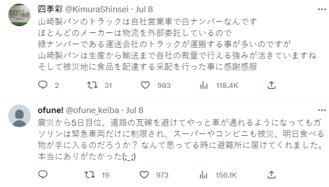 日本推特帳戶最多情報局 ( @tyomateee ) 近日貼出了這些照片,闡述為何山崎麵包能夠被大家持續購買的理由,其實這些照片都是山崎麵包的貨車,時常在日本受到天災事故的時候,以熱心公益的緣由到災害處提供物資給災民,可以看到這些車輛不論是毀壞的道路還是雪地,都使命必達的到現場,這也是讓民眾如此熱愛該品牌的原因。