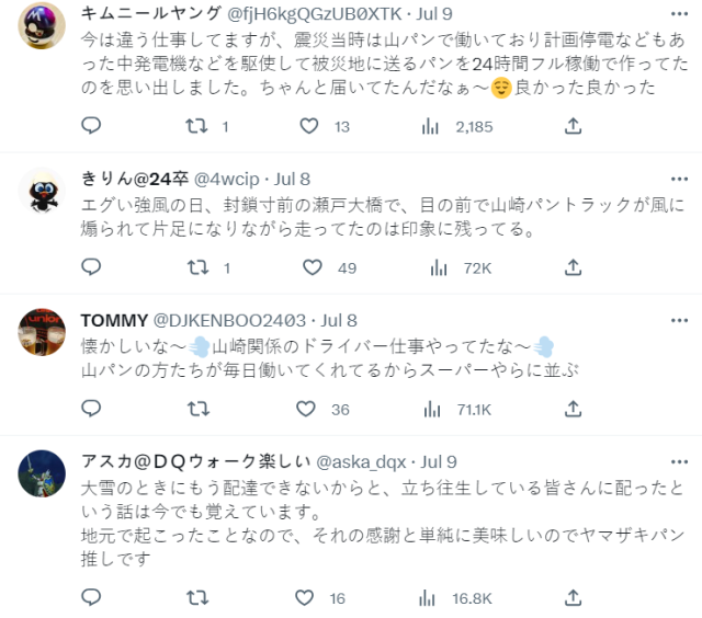 更有不少人分享了山崎麵包的事蹟,可以看到真的各種災害或氣候艱困的時候,山崎總是使命必達,許多正面的形象都讓民眾抱持感謝,也是讓這個品牌始終被民眾喜愛的原因。