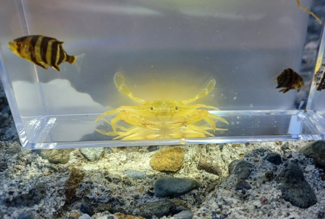 因為螃蟹的體色淺,攝影時的燈光又照在身上,再加上魚缸後面的反射,看起來就好像螃蟹自體朦朧地發光一般。