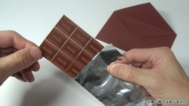 更有趣的是,包裝部分也完全比照真正的明治巧克力片一樣,在以牛奶巧克力的外盒設計成信封的模樣,再用錫箔紙將巧克力郵票包起來,如此一來再拿起的過程,感覺就像是真的在準備食用這項點心一樣...不過,你依然不能吃它就是了。