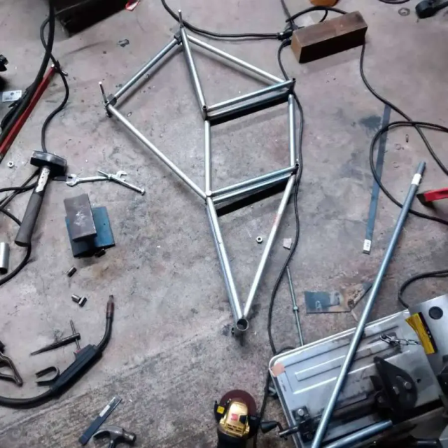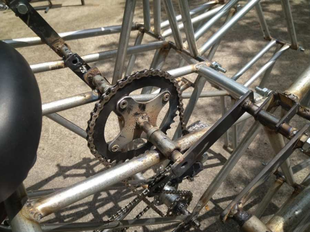 推主表示因為沒有這麼大的空間能做出像 Theo Jansen 那麼大的作品,在網路上搜尋其他作家的作品時,發現有使用自行車當作動力的成品,決定透過自己銲接與機具的才能,試著用自行車打造看看。