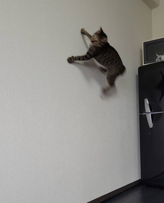原來推主的同居人是貓啊!這樣就合理了……不對!貓爬到牆上也很少見吧!!這位也太有活力了!