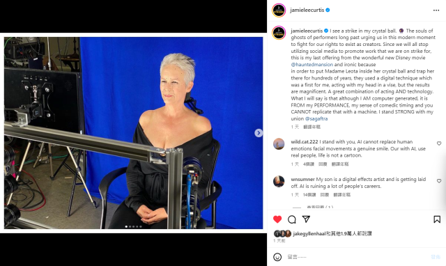 在演員工會正式宣佈罷工、停止一切宣傳和表演工作的前兩天,今年剛拿下奧斯卡最佳女配角的潔美李寇蒂斯(Jamie Lee Curtis)就已在社群媒體上針對掃描演員肖像的議題發文表示:「由於我們都將停止利用社群媒體來宣傳我們正因此罷工的作品,這就是我為精彩的迪士尼新片《幽靈公館》張貼的最後一篇貼文了。諷刺的是,為了將萊奧塔夫人(寇蒂斯飾演的角色)放進她的水晶球中,並將她困在裡頭數百年,他們使用了一種數位技術 — 而且也是我首次使用這項技術 — 讓我在一個裝置裡表演,但最後的成果是很棒,是表演與技術的完美結合。我想說的是,雖然我的臉是電腦生成,但這全是出自於我本人的表演,出自於我對喜劇節奏的敏銳度,這是你無法用機器複製的。我強力支持我所屬的工會。」