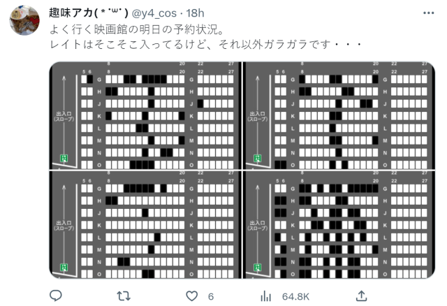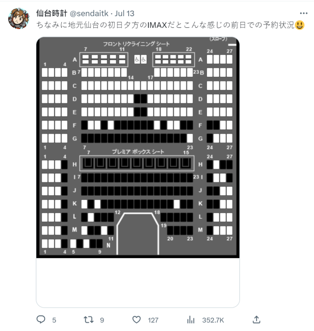 那我們直接來看電影院的狀況,網友貼出位於仙台首映首日的 IMAX 廳預約狀況,看得出來好位置也都被搶光光了,雖說還沒滿座,不過不久後也是漸漸被填滿了 XD。