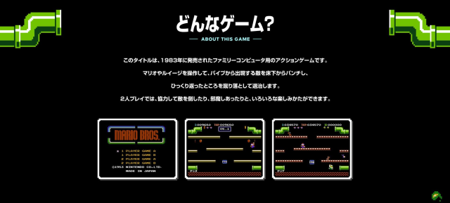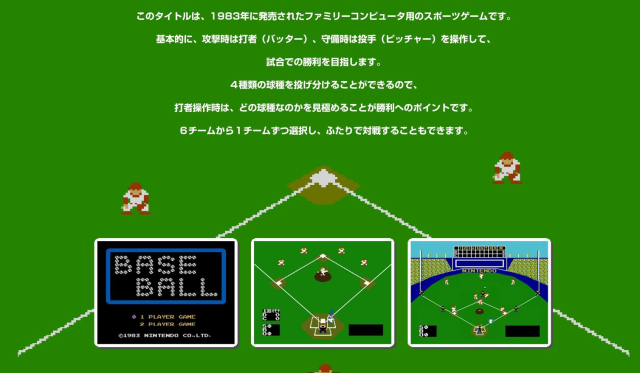 例如目前公開的 1983 年 7 款遊戲中,就包括了最經典的《棒球》、《瑪利歐兄弟》、《五子棋》、《大金剛》等,而且使用的圖片都是當年發售的原畫、還有超詳盡的遊戲解說,對於懷舊系玩家可說是相當實用。