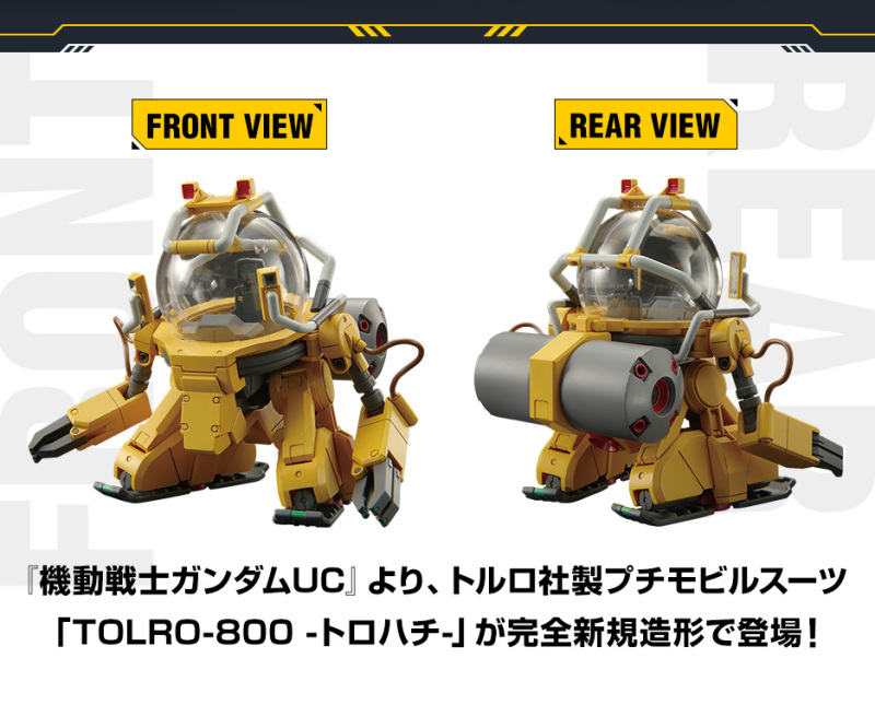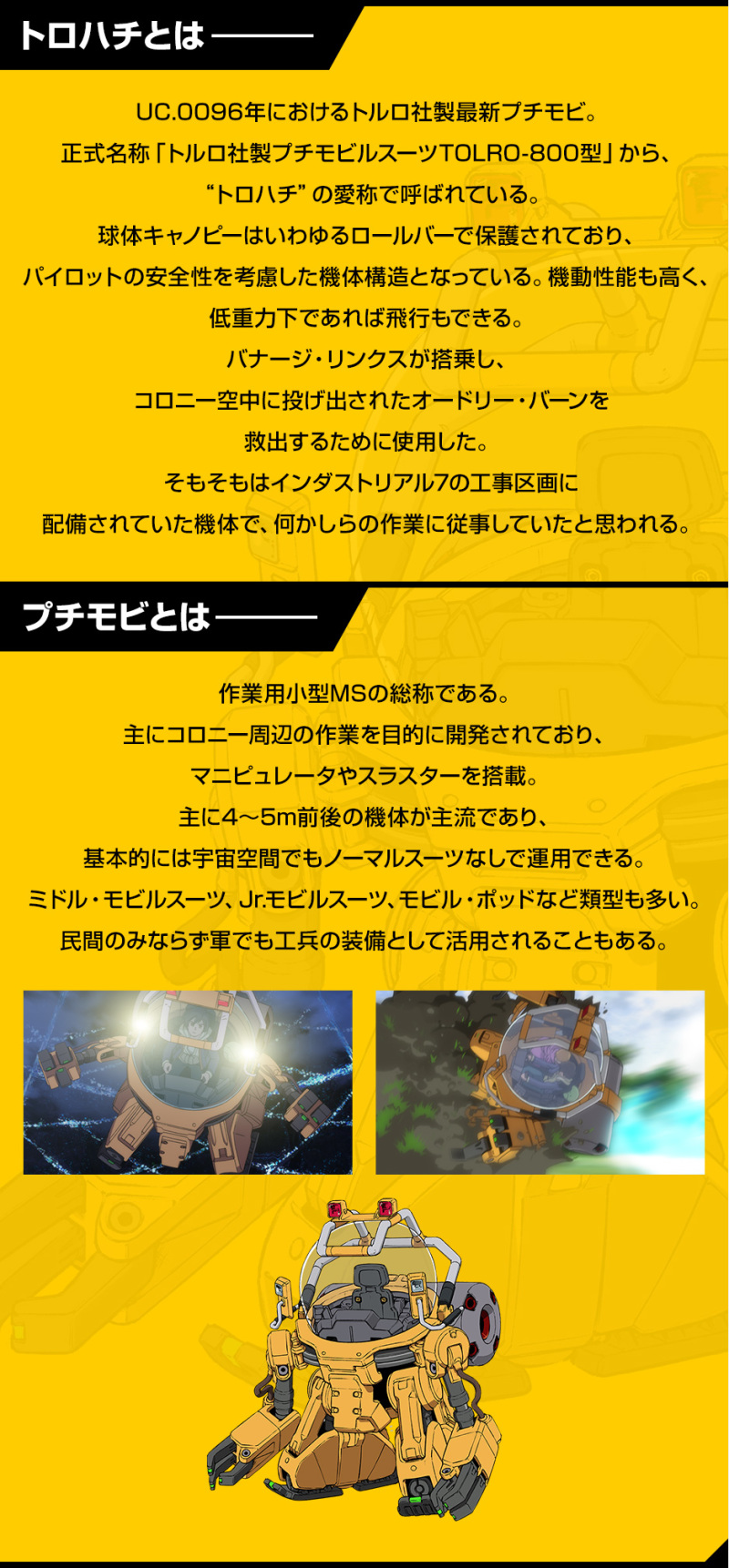 被人們稱為「特洛八」的特魯洛社製迷你MS TOLRO-800 型是《機動戰士鋼彈UC》劇中宇宙世紀 0096 年最新型的工程用迷你 MS,機體全高約 3 米,具備透明罩式駕駛艙、可進行多種工程的靈活機械臂、推進背包等,能在殖民地內部的重力環境、殖民地外壁的宇宙空間中運用。劇中主角巴納吉便是用這架機體救下女主角米妮瓦。